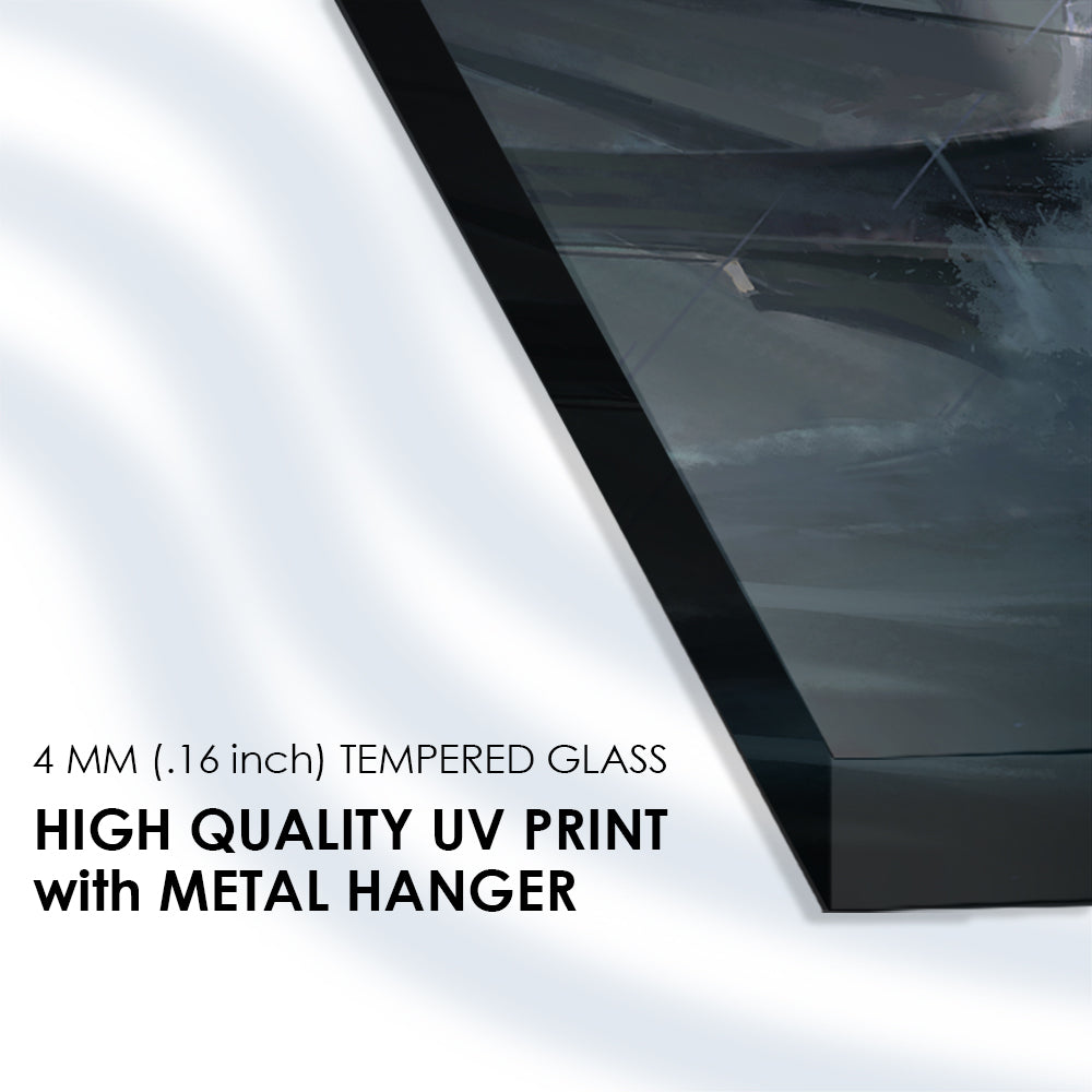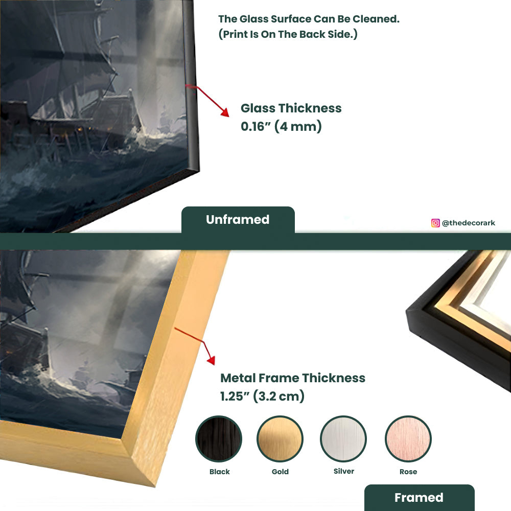 Embark on a voyage through history with this tempered glass art featuring a painting of ancient warships traveling on rough seas. Its dramatic depiction and dynamic composition evoke the spirit of maritime adventure, adding a sense of intrigue and historical charm to your decor.