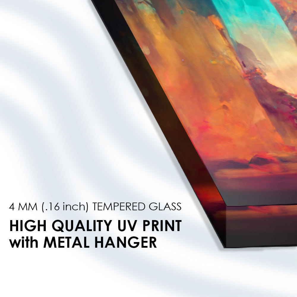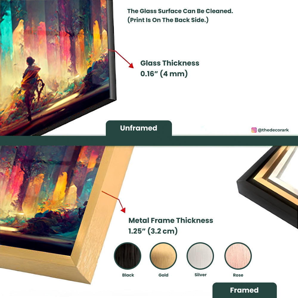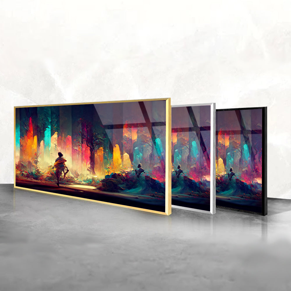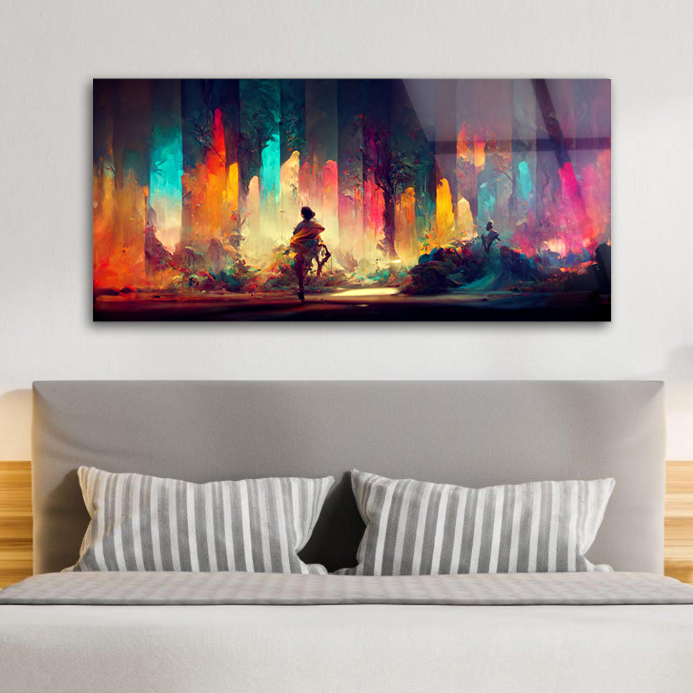 Embrace the tranquility of nature with this tempered glass art showcasing a blurred colorful painting of a person in the forest. Its dreamy ambiance and vibrant colors evoke a sense of serenity and adventure, adding a touch of natural beauty and artistic flair to your interior.