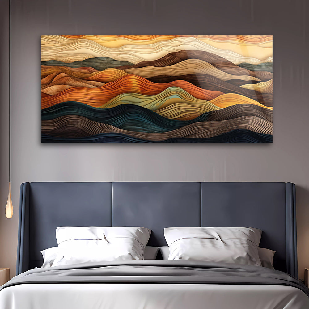 Dive into a sea of colorful waves with this tempered glass abstract painting. Its vibrant hues and rhythmic patterns evoke a sense of movement and vitality, inviting you to ride the waves of creativity. Add a touch of dynamic flair to your space with this captivating artwork.