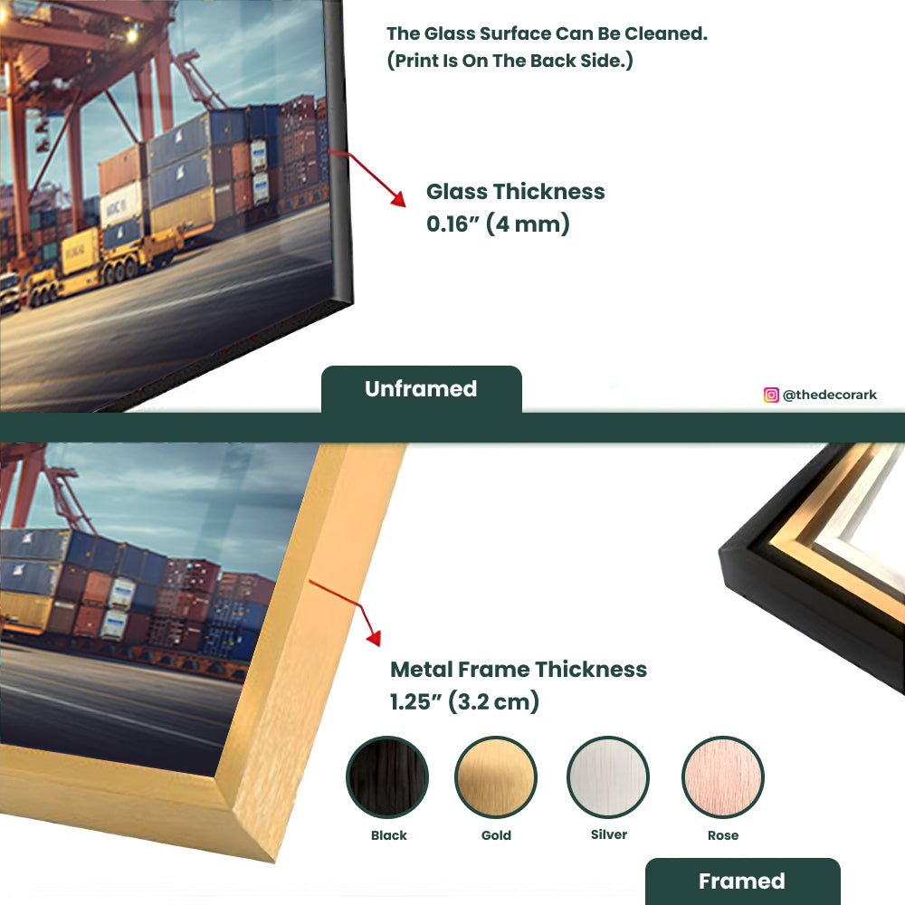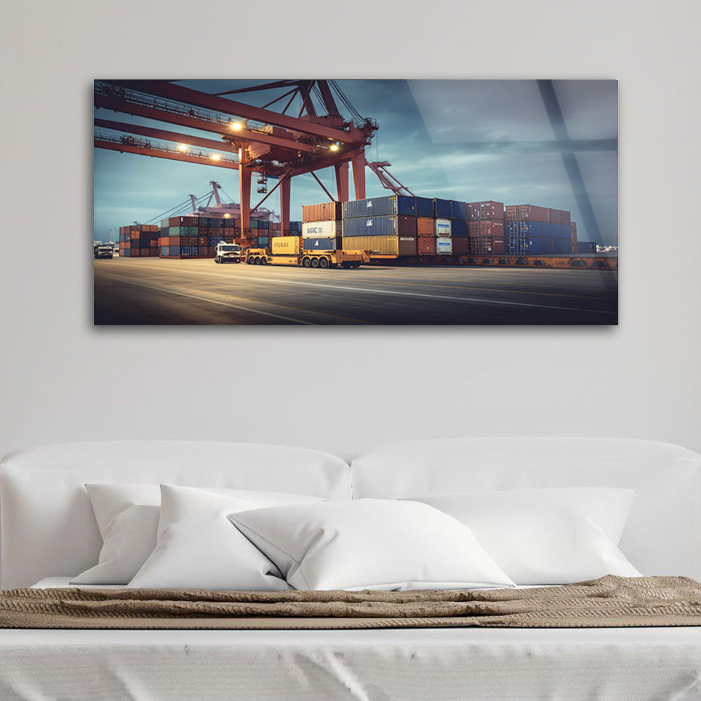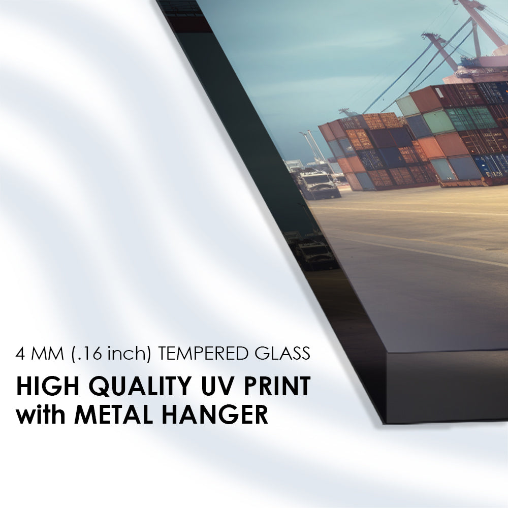 Celebrate industrial beauty with this tempered glass art portraying a container truck. Its bold depiction and urban charm capture the essence of transportation, making it an intriguing addition to any space with a modern or industrial aesthetic.