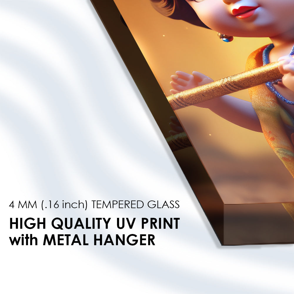 Embrace the divine childhood of Lord Krishna with the "Little Krishna Holding a Flute" tempered wall art. This sacred piece beautifully portrays the young Krishna with his flute, symbolizing innocence and devotion. Whether displayed in your prayer room, meditation space, or any area, it brings an aura of divinity and childlike joy to your surroundings.