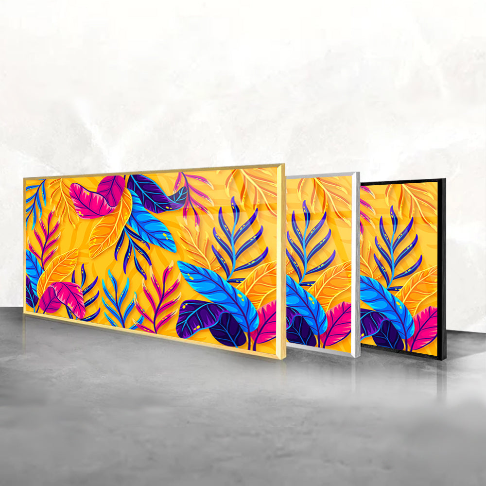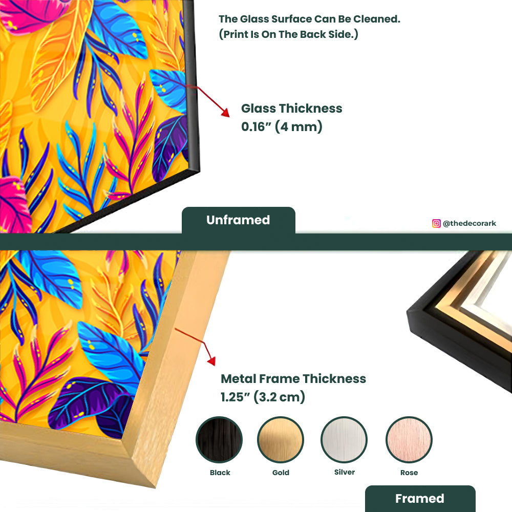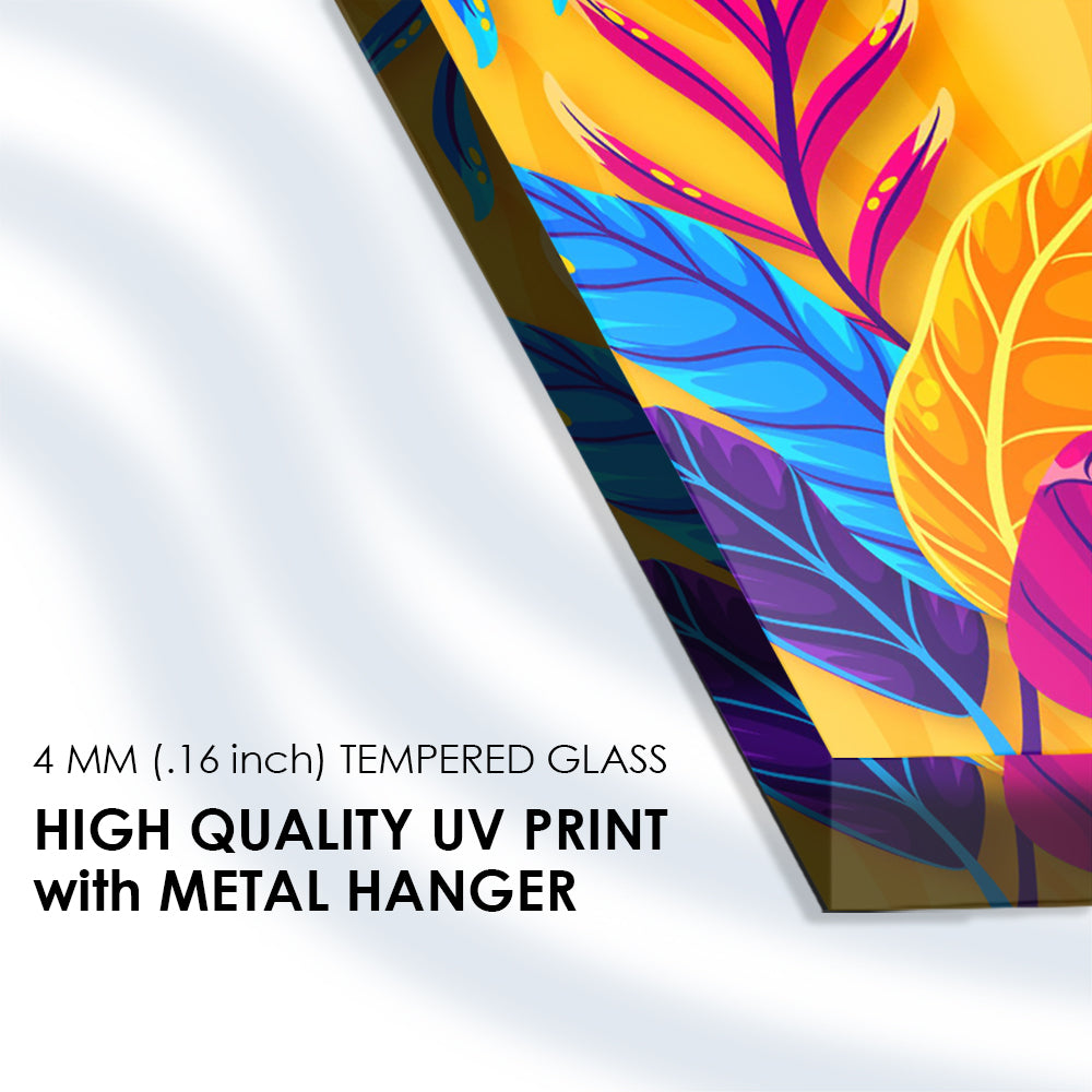 Bring the outdoors indoors with this tempered glass art featuring a modern colorful pattern with leaves. Its vibrant hues and organic motifs infuse your space with natural beauty and artistic sophistication, creating a serene and inviting ambiance that enhances any room decor.