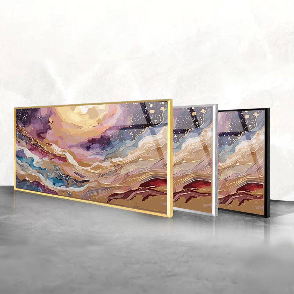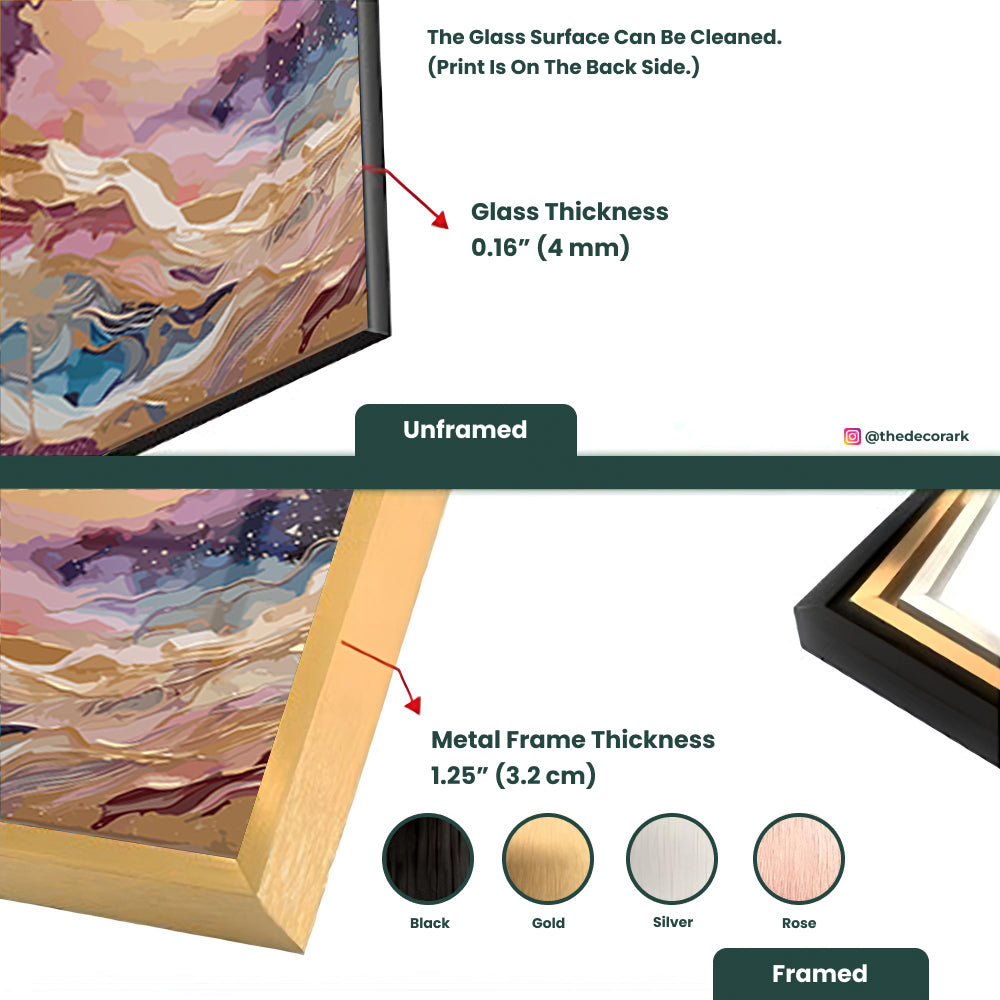 Immerse yourself in the vibrant beauty of multicolor harmony with this tempered glass abstract artistry. Its dynamic composition and vivid hues create a sense of artistic expression and energy, adding a bold statement to any room. Let the harmonious blend of colors in this artwork invigorate your space with its lively presence.