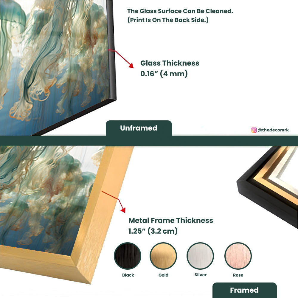 Immerse yourself in the ethereal beauty of the ocean with this tempered glass art featuring a jellyfish swarm. Its graceful forms and translucent hues evoke the mysteries of the deep sea, adding a serene yet captivating ambiance to your space.