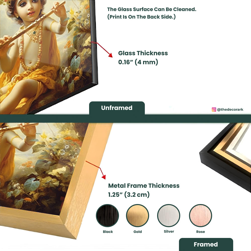 Connect with the divine serenity of Lord Krishna with the "Portrait of Young God Krishna in the Forest" tempered wall art. This sacred piece beautifully portrays the young Krishna in a forest setting, symbolizing his divine presence in nature. Whether displayed in your prayer room, meditation space, or any area, it radiates an aura of divinity and spiritual tranquility.