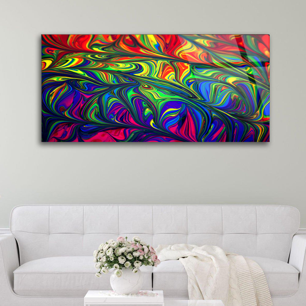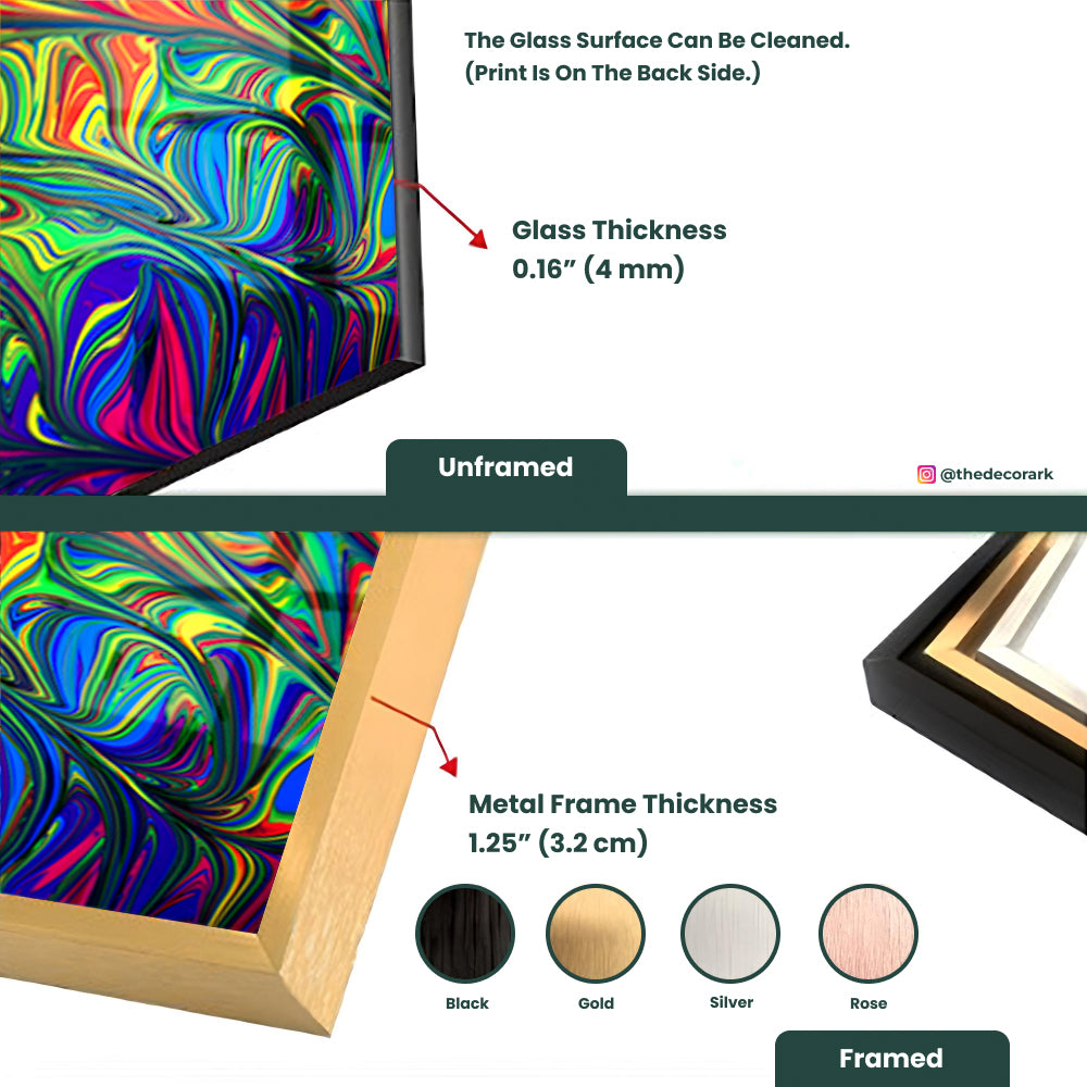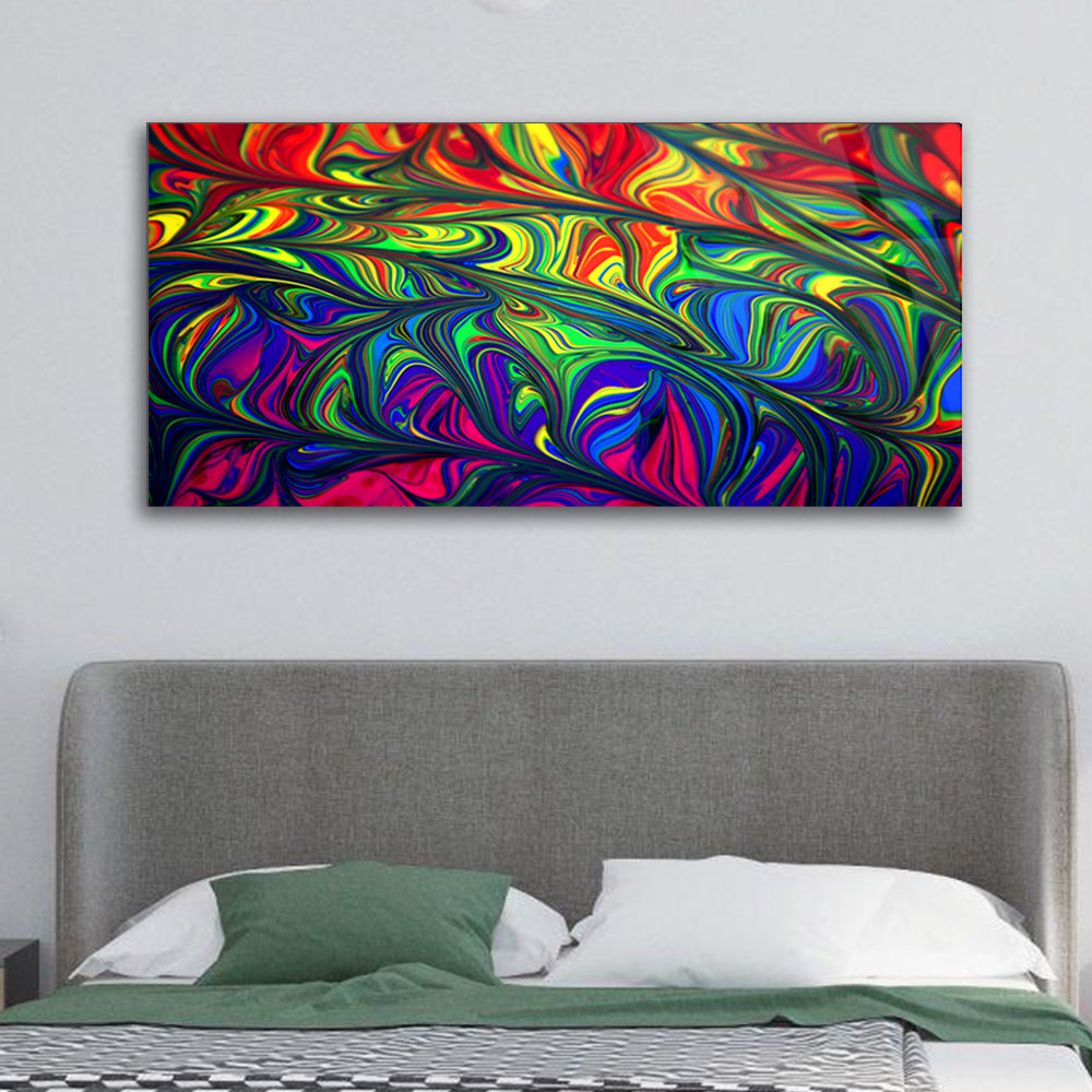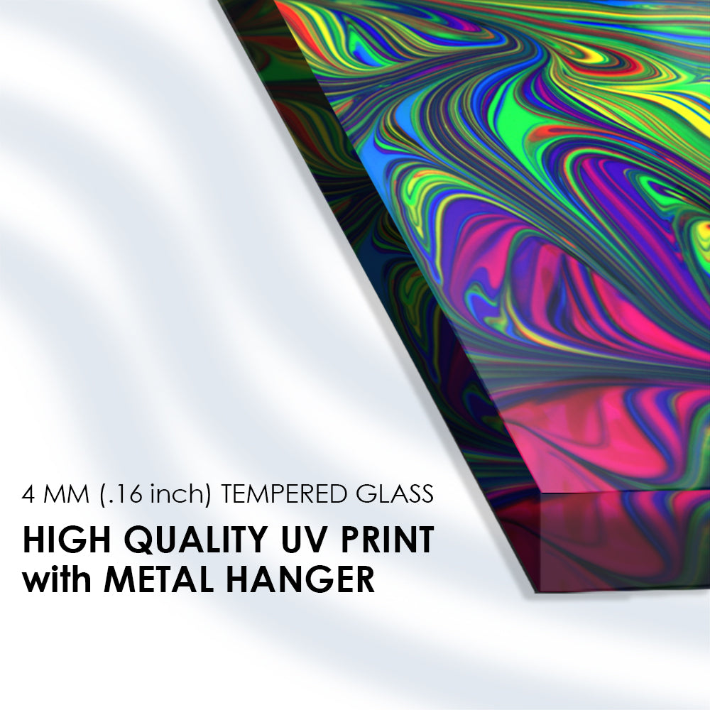 Unleash psychedelic colors with this captivating abstract artwork on tempered glass. The vibrant hues and intricate patterns create a visual spectacle that adds energy and creativity to your space. Elevate your decor with a burst of color and contemporary flair, making a bold statement on your walls.