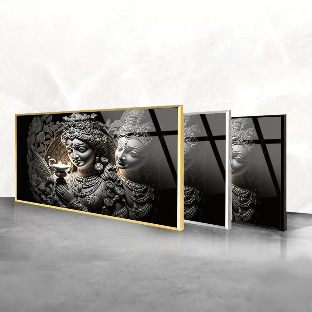 Embrace the divine presence with this tempered glass art featuring a sculpture of Lord Radha and Krishna. Its intricate details and timeless elegance pay homage to the sacred bond between these divine beings, creating a sense of reverence and tranquility in any space. Add a touch of spiritual grace to your decor with this exquisite artwork.