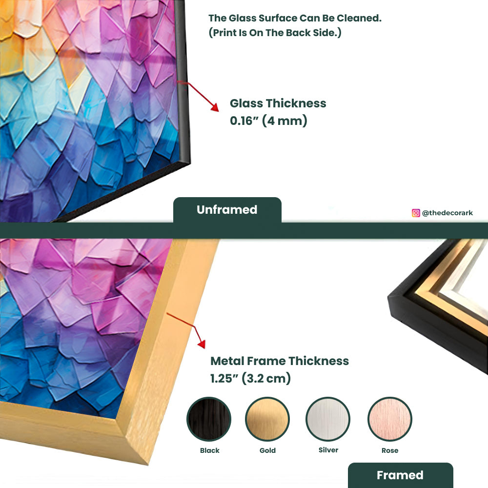 Experience the fusion of color in "Spectral Harmony," a tempered glass wall art that harmonizes your living space. This artwork radiates positive vibes, transforming your home into a decorative haven of balance and tranquillity. Customizable in size and optionally framed, it offers a personalized touch to suit your preferences. Easy to clean and maintain, "Spectral Harmony" not only adds a touch of elegance to your walls but also ensures a hassle-free and enjoyable experience in your living environment.