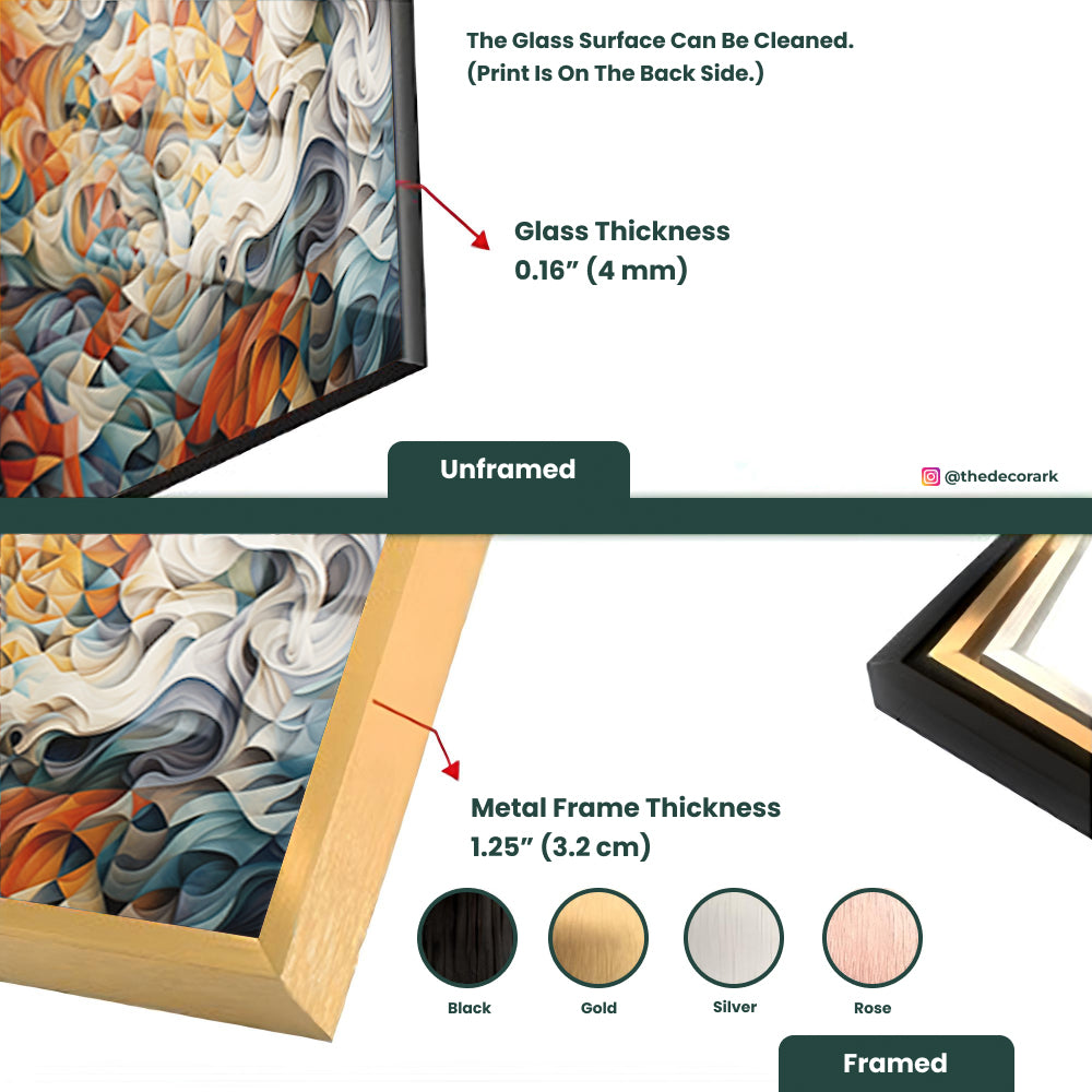 Immerse yourself in the mesmerizing allure of "Swirling Colors: Glass Abstract Bliss," where tempered glass captures the beauty of swirling hues. Crafted with precision, this artwork is a celebration of abstract patterns that evoke a sense of bliss and tranquillity. The glass abstract bliss adds a touch of serenity to your walls, making it a perfect choice for spaces dedicated to relaxation and contemplation. Elevate your surroundings with this swirling masterpiece, creating a visual escape within your home. Immerse yourself in the calming swirls of colors that transform your walls into a sanctuary of tranquillity.