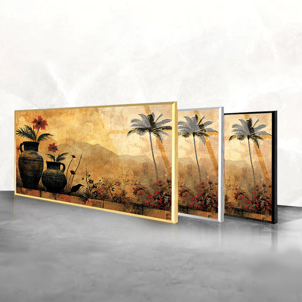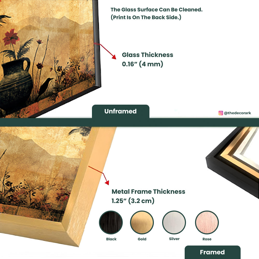 Celebrate the beauty of nature with this tempered glass vase portrait artwork. Its delicate portrayal of a vase with natural elements evokes a sense of organic elegance and tranquility, adding a touch of botanical charm to any room. Let the beauty of nature blossom in your space with this exquisite artwork.