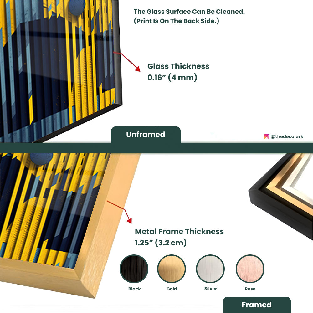 Immerse yourself in the vibrant fusion of yellow and blue with this tempered glass abstract artwork. Its dynamic interplay of colors and fluid forms evokes a sense of energy and movement, inviting you to explore the captivating beauty of abstract expression. Add a burst of color to your space with this mesmerizing artwork.